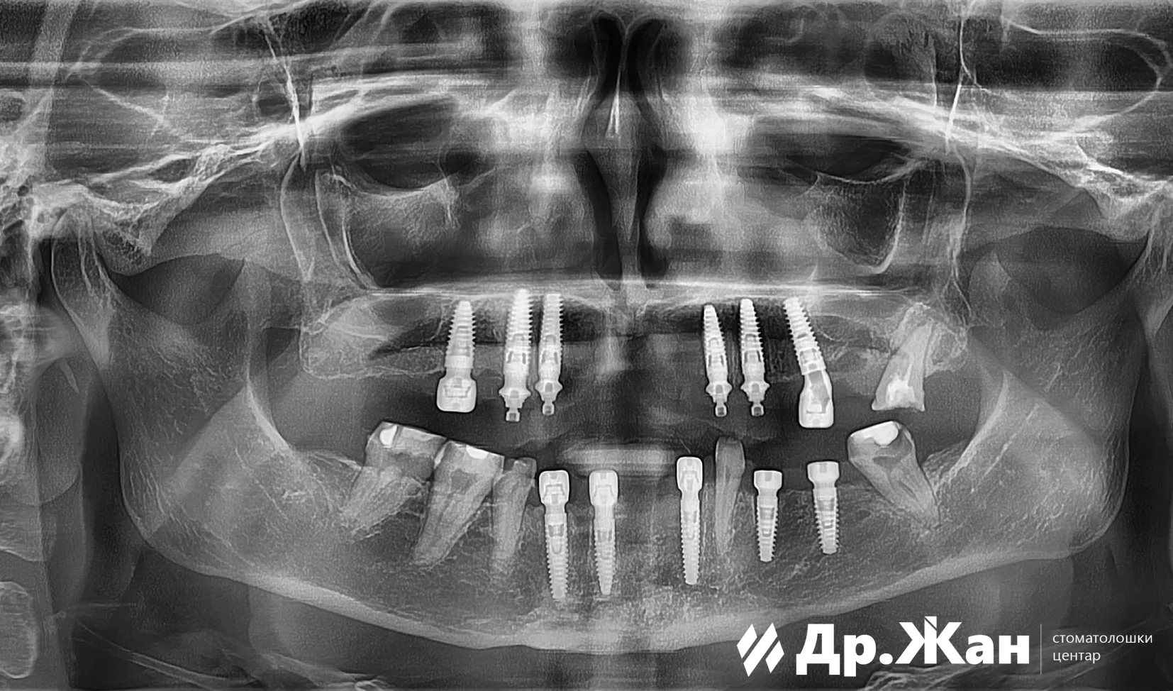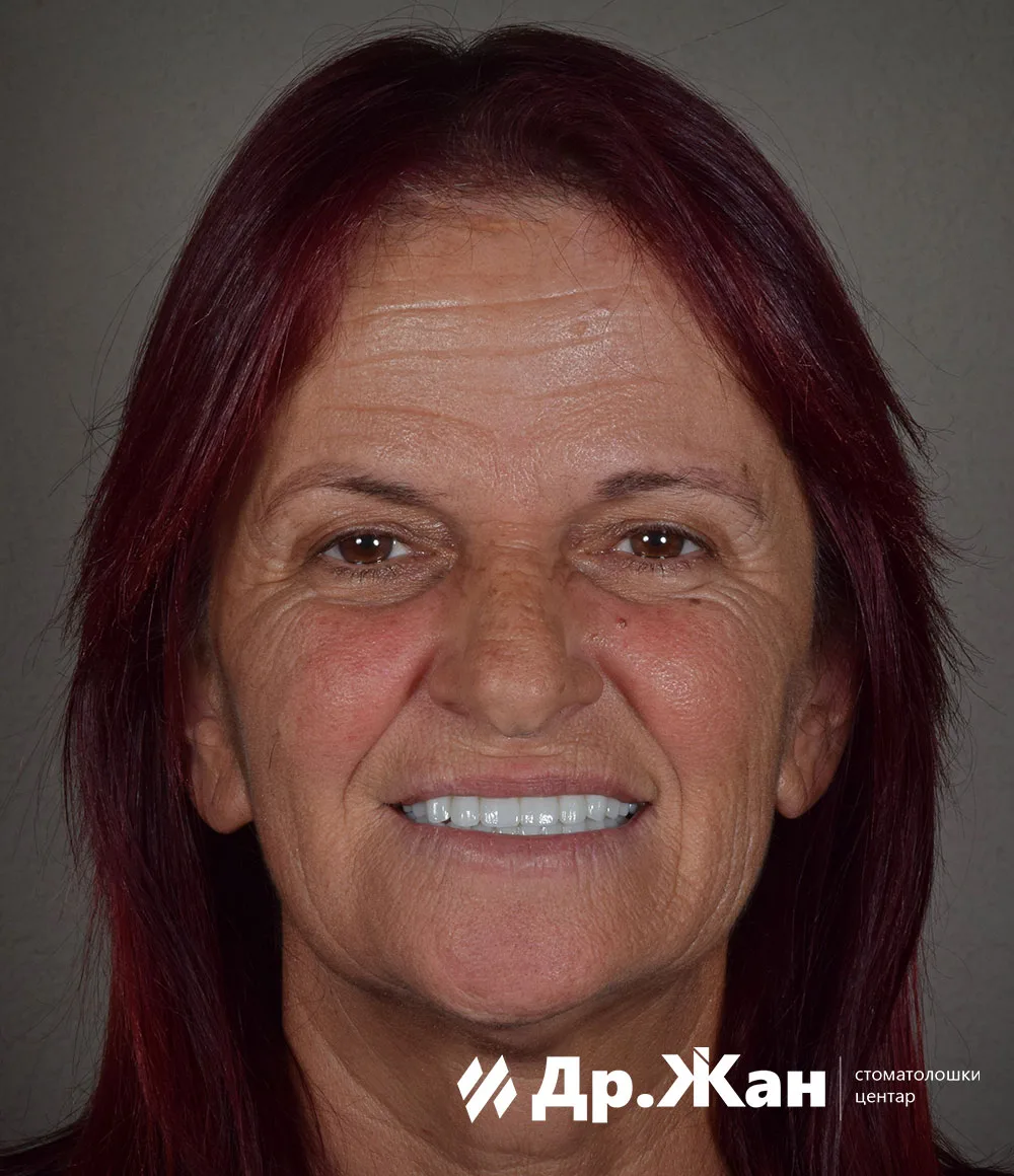 По 6 месеци заздравување и остеоинтеграција на забните импланти, пациентката се врати за нејзина финална реставрација. Случајот беше тежок III степен со унапредување на долната вилица. Но, со користење на дигитален работен тек и детално планирање, беше направена тотална реконструкција на устата со хибридна циркониум-титаниумска конструкција и циркониумски коронки и мостови. На оваа прекрасна пациентка ѝ беше обезбедена убава, нова, функционална и естетска насмевка.