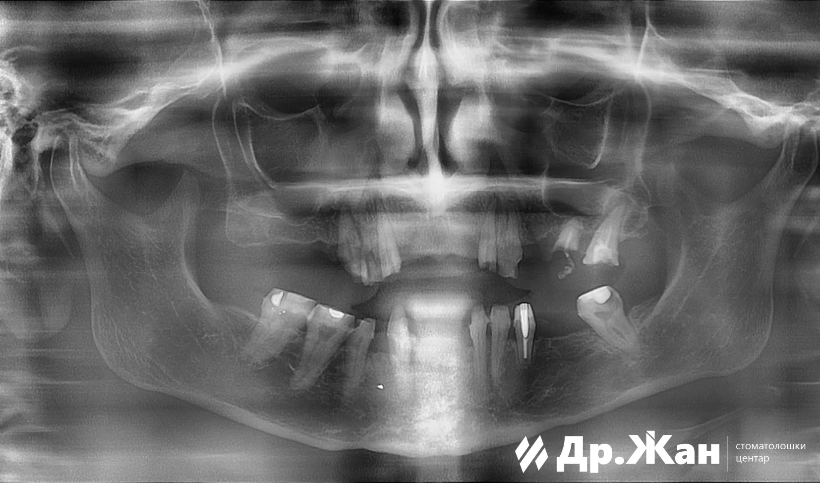 По внимателно испитување и анализа, планот беше да се извлечат сите заби во горната вилица, а некои да се задржат во долната вилица за полесен премин за пациентката. Веднаш по вадењето, беа поставени 6 импланти во горната вилица и 5 забни импланти во долната вилица. Имплантската терапија беше извршена со дигитален работен тек и со употреба на хируршки водичи. ѝ беа обезбедени фиксни привремени заби за периодот на заздравување.