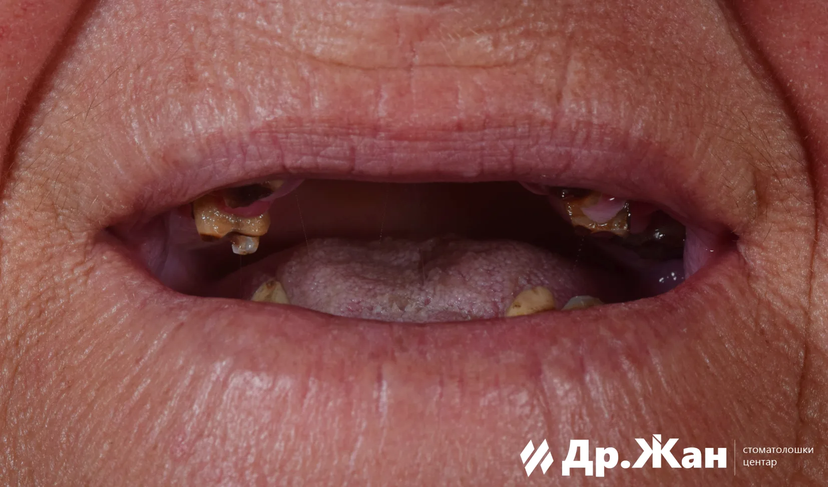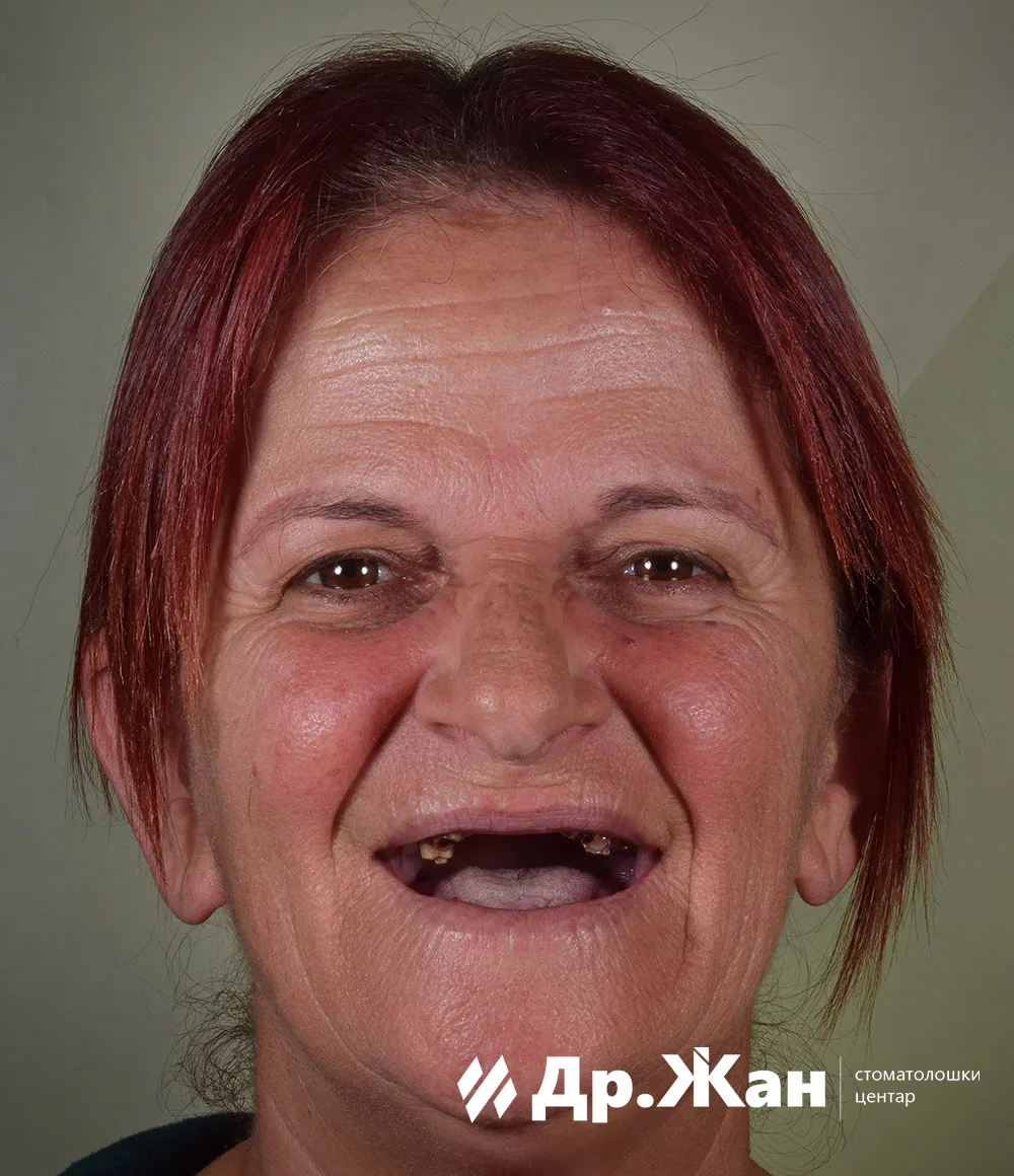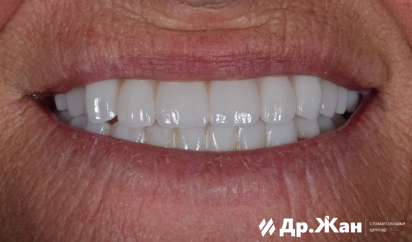 По 6 месеци заздравување и остеоинтеграција на забните импланти, пациентката се врати за нејзина финална реставрација. Случајот беше тежок III степен со унапредување на долната вилица. Но, со користење на дигитален работен тек и детално планирање, беше направена тотална реконструкција на устата со хибридна циркониум-титаниумска конструкција и циркониумски коронки и мостови. На оваа прекрасна пациентка ѝ беше обезбедена убава, нова, функционална и естетска насмевка.